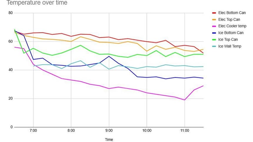 As you can see, although the EverFrost 2 got colder faster, the cans themselves did not follow suit. In fact, the RTIC ice cooler cooled both the cooler and the cans faster than the electric cooler.