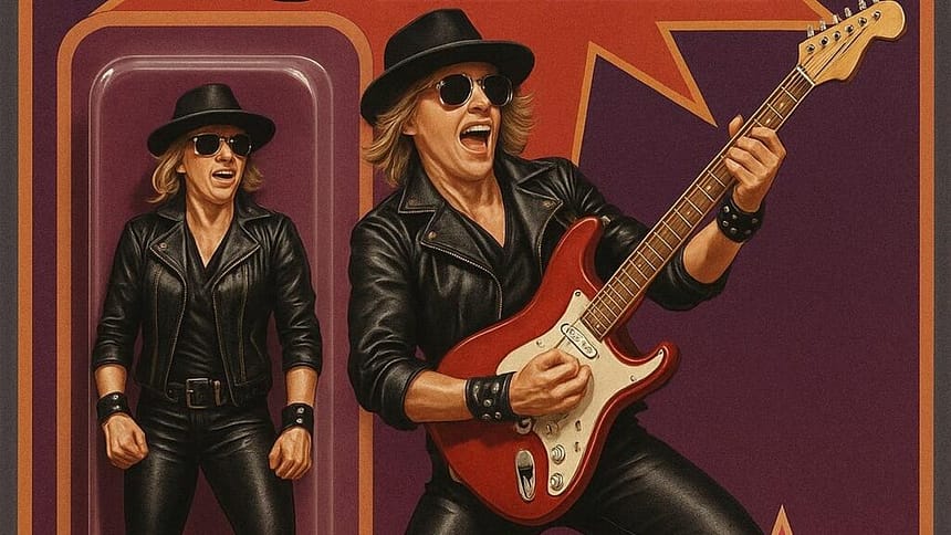 I tried a new version with blue jeans and a pink Telecaster guitar. It delivered but forgot the action figure part and the new image looked further removed from my actual facial appearance. A third tweak took me into Billy Idol territory when I asked for spiky blonde hair. My action figure’s leg ended up outside of the “plastic” packaging window. I tried again.