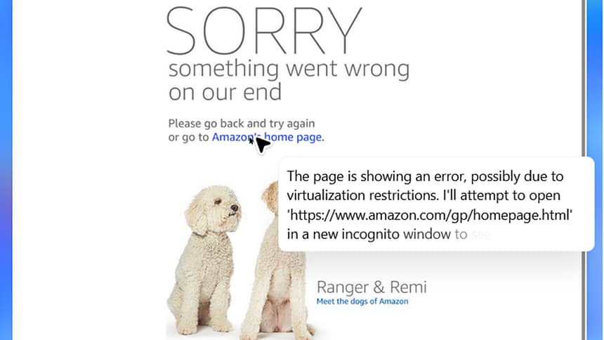 Simply, the agent wasn’t able to do anything on Amazon at all. It ran into the “503 error” page, amusingly accompanied by a picture of a dog. Every attempt to get around the error page led to the same error page, albeit with different canines.