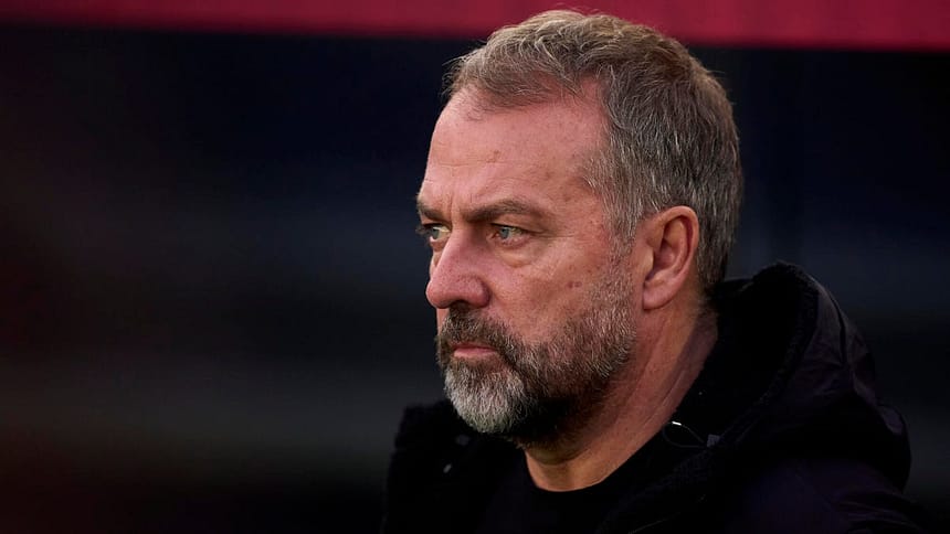 Hansi Flick, manager of FC Barcelona, looks on prior to the La Liga EA Sports match between FC Barcelona and Athletic Club at Spotify Camp Nou on November 22 in Barcelona, Spain.